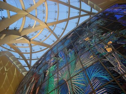 被切割開來的小玻璃,最后拼裝起來,組成了《生命之源》。16米高的壁畫上,匯集了30萬塊切割成各種形狀的小塊彩色玻璃。為了讓作品看起來更通透,彩色玻璃沒往墻上貼,而是貼在了半透明的無色玻璃上。