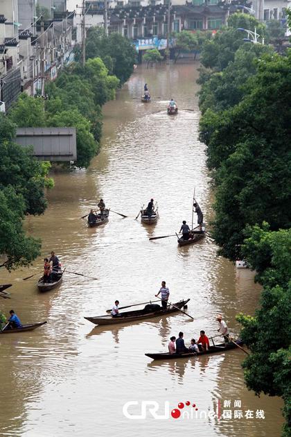2011年6月20日,浙江蘭溪城里東門至南門路段水漫金山,市民坐船出行。水面上數只小木船構成城市版“江南水鄉”。 受6月以來的第四輪強降雨影響,浙江蘭溪2011年6月20日7點30分迎來了自1955年以來的最大洪峰,達33.73米,超過“6.16”洪峰水位33厘米。據蘭溪防汛辦提供的數據,截至上午10點,洪峰水位33:68m,超危急水位2.68米,蘭溪抗洪全線告急。 據記者在蘭溪現場報告,蘭溪城市內澇嚴重,最深處積水已在1.5米以上,進城的幾個入口都已遭洪水淹沒,蘭溪城內已遭洪水圍困,目前交通已經中斷,而蘭江干堤低處洪水已漫過干堤。 記者從蘭溪市防汛辦核實,蘭溪市內內澇嚴重,蘭溪干堤低處洪水確已漫過干堤。特別是香溪鎮、女埠街道、赤溪街道三個鄉鎮街道形勢最為嚴峻。目前,女埠片下方街道處干堤進水嚴重,下方街道居民住宅進水已半層左右,蘭溪市防指已命令巖山片、吳村片、匯潭前方片、女埠片、童家埠片、泉湖片區域內的群眾全部撤離。 目前,蘭溪市上下正嚴防死守抗此56年來最大洪峰。 約30萬群眾轉移 據初步統計,浙江省已經累計投入搶險33.6萬人次,機械14375臺套、編織袋104.6萬條以及一批沙石料、木材、鋼材等搶險物資;轉移群眾29.2萬人,解救受困群眾1.88萬人. |