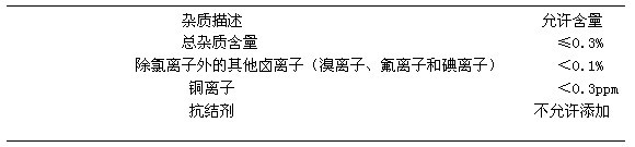 鹽霧試驗箱的鹽溶液應當按溶解比例為5±1份的氯化鈉,和95份的水配置,水要符合說明D1193類型Ⅳ中的要求(除了本規(guī)程對氯離子的限制外,鈉離子可以忽略)。對于鹽的化學成分要謹慎小心才行,使用的鹽應為氯化鈉,總的雜質(zhì)量不超過0.3%。除氯離子外的其他鹵素離子(溴離子、氟離子和碘離子)的含量應低于鹽的含量的0.1%(質(zhì)量),銅離子含量要小于總量的0.3ppm,添加抗結劑的氯化鈉不允許使用,因為此類添加劑起抗腐蝕劑的作用。表1列出了的雜質(zhì)含量的限制。